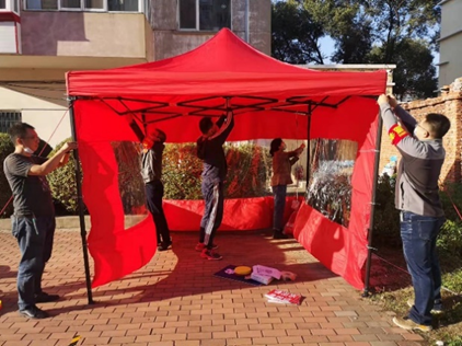 接到檢測點(diǎn)遷移指令后,支部黨員干部又緊急集結(jié),調(diào)用研究所應(yīng)急帳篷在居民區(qū)空曠場地連夜搭設(shè)核酸檢測點(diǎn),和下沉黨員一起建立引導(dǎo)區(qū),鋪貼安全線,迅速完成應(yīng)急設(shè)備的安裝調(diào)試,保證核酸檢測工作順利進(jìn)行。為避免帳篷被大風(fēng)翻卷,物資受損,室外核酸檢測點(diǎn)每日都要重新搭建。為了讓社區(qū)工作人員充分休息,支部黨員和志愿者凌晨5時前到崗,確保各項(xiàng)準(zhǔn)備工作在5時40分前就緒。每次檢測結(jié)束,他們又將全部設(shè)備設(shè)施收集整理,運(yùn)回倉庫妥善保管。