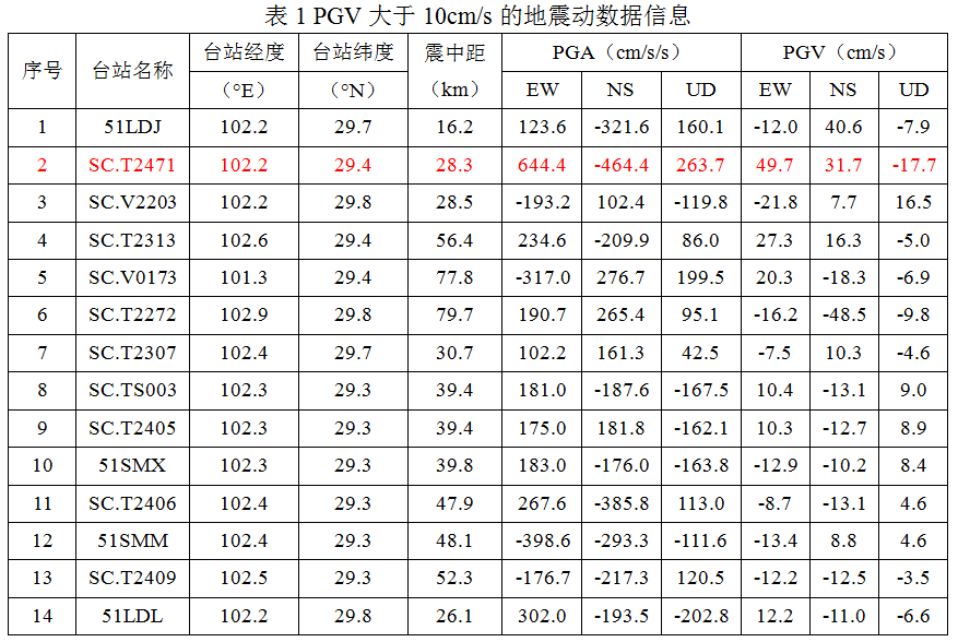 和歷史地震相比,本次地震記錄到的地震動PGV/PGA明顯偏大。2008年汶川8.0級地震臥龍臺站記錄到的地震動PGA為957.7cm/s2,PGV為51.7cm/s。2019年四川宜賓長寧地震珙縣中學(xué)臺站記錄到的地震動PGA為600cm/s2,PGV為12.6cm/s。本次地震,記錄到的最大地面加速度峰值PGA為644.4cm/s2,PGV高達(dá)49.7cm/s,與汶川地震臥龍臺站記錄到的PGV值十分接近,可見此次地震的破壞能量之大。