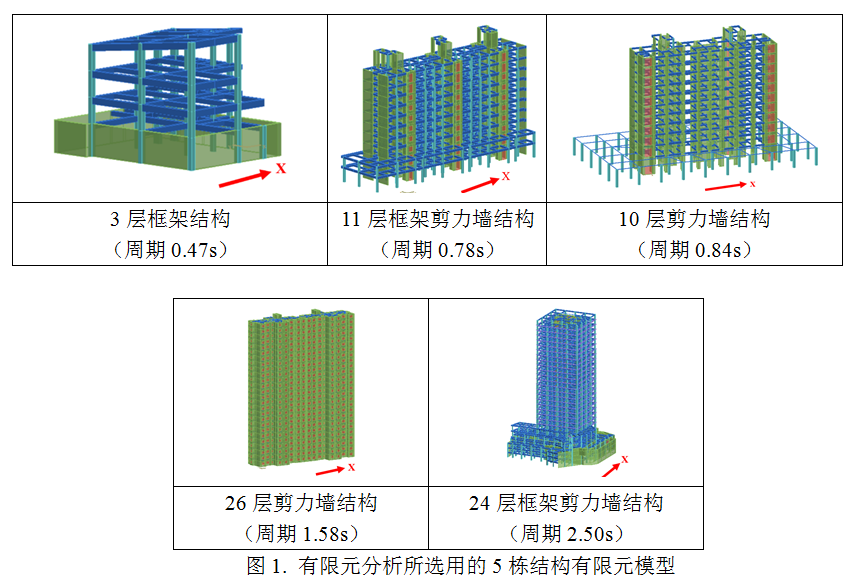 為評估結(jié)構(gòu)在此次地震動的破壞水平,選取了實際記錄到的儀器烈度對應(yīng)的5組強震記錄,開展了針對當(dāng)?shù)乜拐鹪O(shè)防烈度為8度0.2g的5棟典型鋼筋混凝土結(jié)構(gòu)房屋的非線性動力響應(yīng)時程分析。5棟結(jié)構(gòu)包括1棟框架、2棟框剪及2棟剪力墻,結(jié)構(gòu)基本周期從小到大分別是0.47s,0.78s,0.84s,1.5s和2.5s。分析主要給出了對結(jié)構(gòu)安全和建筑內(nèi)人員體感影響明顯的層間相對位移和樓層加速度響應(yīng)結(jié)果。表2為選取的地震動記錄相關(guān)信息。圖1為選取的5棟結(jié)構(gòu)的有限元模型示意圖,圖2至圖6為五棟結(jié)構(gòu)的初步分析結(jié)果。