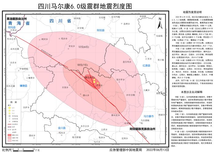 發(fā)布時(shí)間: 2022-06-22 點(diǎn)擊數(shù)量:42822022年6月10日,四川阿壩州馬爾康市先后發(fā)生5.8、6.0、5.2級(jí)地震,屬震群型地震。地震發(fā)生后,按照應(yīng)急管理部部署,中國(guó)地震局組織四川省地震局開(kāi)展應(yīng)急處置工作,依照《地震現(xiàn)場(chǎng)工作 第3部分:調(diào)查規(guī)范》(GB/T 18208.3-2011)、《中國(guó)地震烈度表》(GB/T 17742-2020),通過(guò)災(zāi)區(qū)震害調(diào)查,并綜合應(yīng)用儀器烈度、地震構(gòu)造背景、余震分布、震源機(jī)制、遙感影像等科技支撐成果,確定了此次地震的烈度分布,并依照《地震烈度圖制圖規(guī)范》(GB/T 38226-2019)編制完成《四川馬爾康6.0級(jí)震群地震烈度圖》。