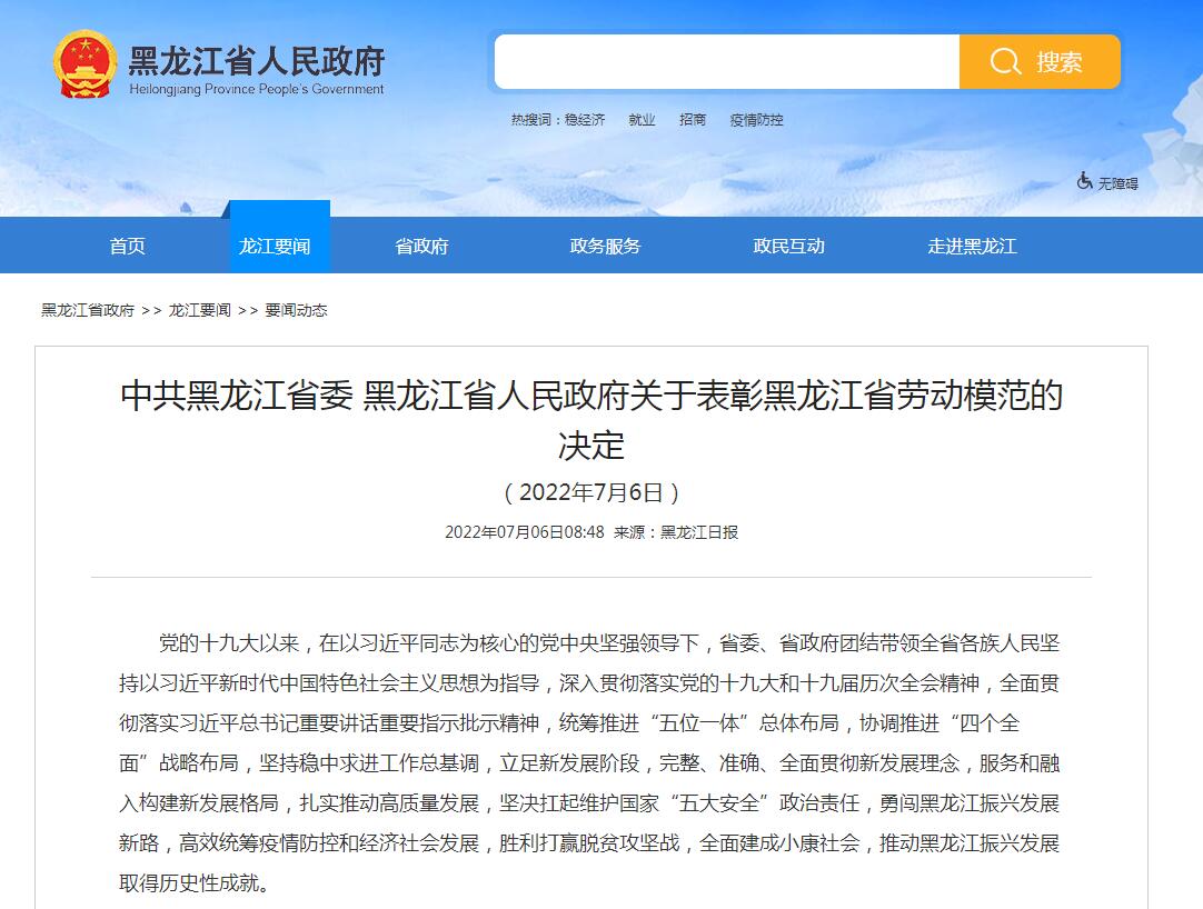 黑龍江省政府:中共黑龍江省委 黑龍江省人民政府關(guān)于表彰黑龍江省勞動(dòng)模范的決定(2022年7月6日)