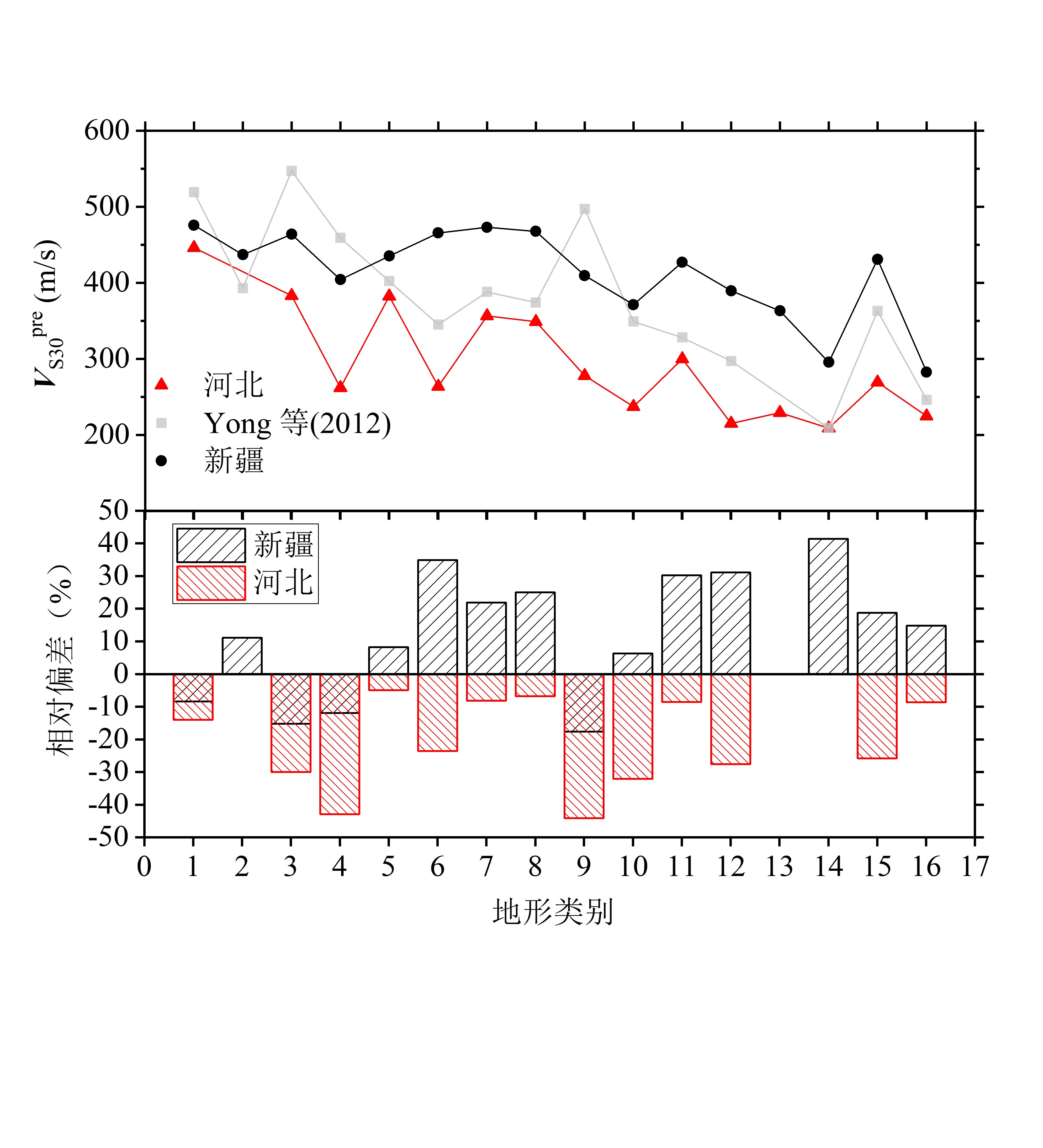 圖2 新疆與河北地區(qū)16個(gè)地形類別的VS30最佳預(yù)測值及與Yong等(2012)結(jié)果的比較
