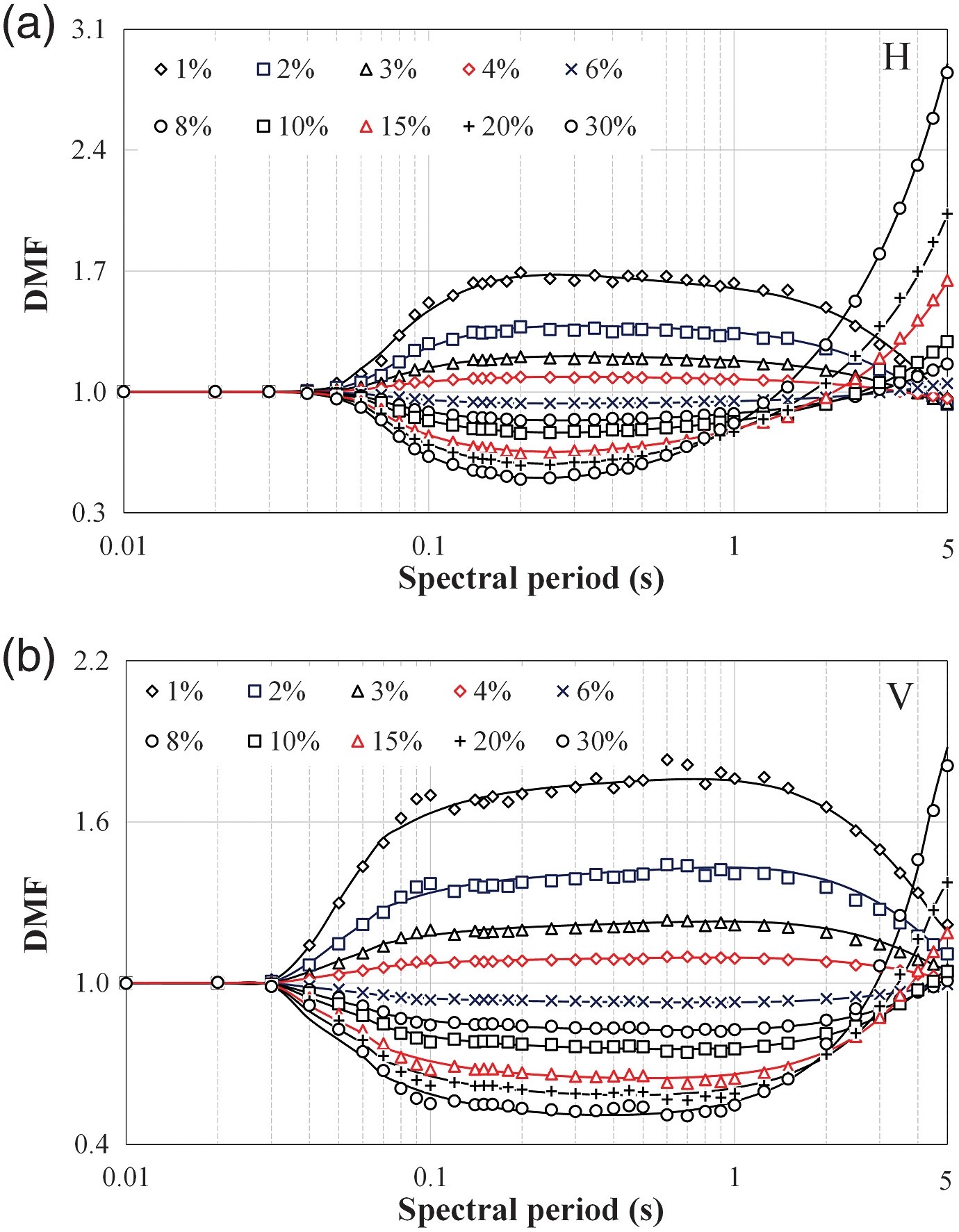 抗震規(guī)范設(shè)計(jì)譜以及地震動(dòng)模型計(jì)算的反應(yīng)譜通常是基于5%阻尼比給出的。而海洋結(jié)構(gòu)的阻尼比并非5%,例如,海底沉管隧道、海底管道、海洋石油平臺(tái)、儲(chǔ)油罐、跨海橋梁等海洋工程結(jié)構(gòu)的阻尼比一般小于5%,裝有隔震支座的建筑和橋梁的阻尼比要大于5%。為得到相應(yīng)結(jié)構(gòu)阻尼比水平下的譜值,最常用方法是建立阻尼修正系數(shù)(DMF)模型,DMF可以在5%阻尼比反應(yīng)譜基礎(chǔ)上進(jìn)行調(diào)整得到其他阻尼比水平的反應(yīng)譜。