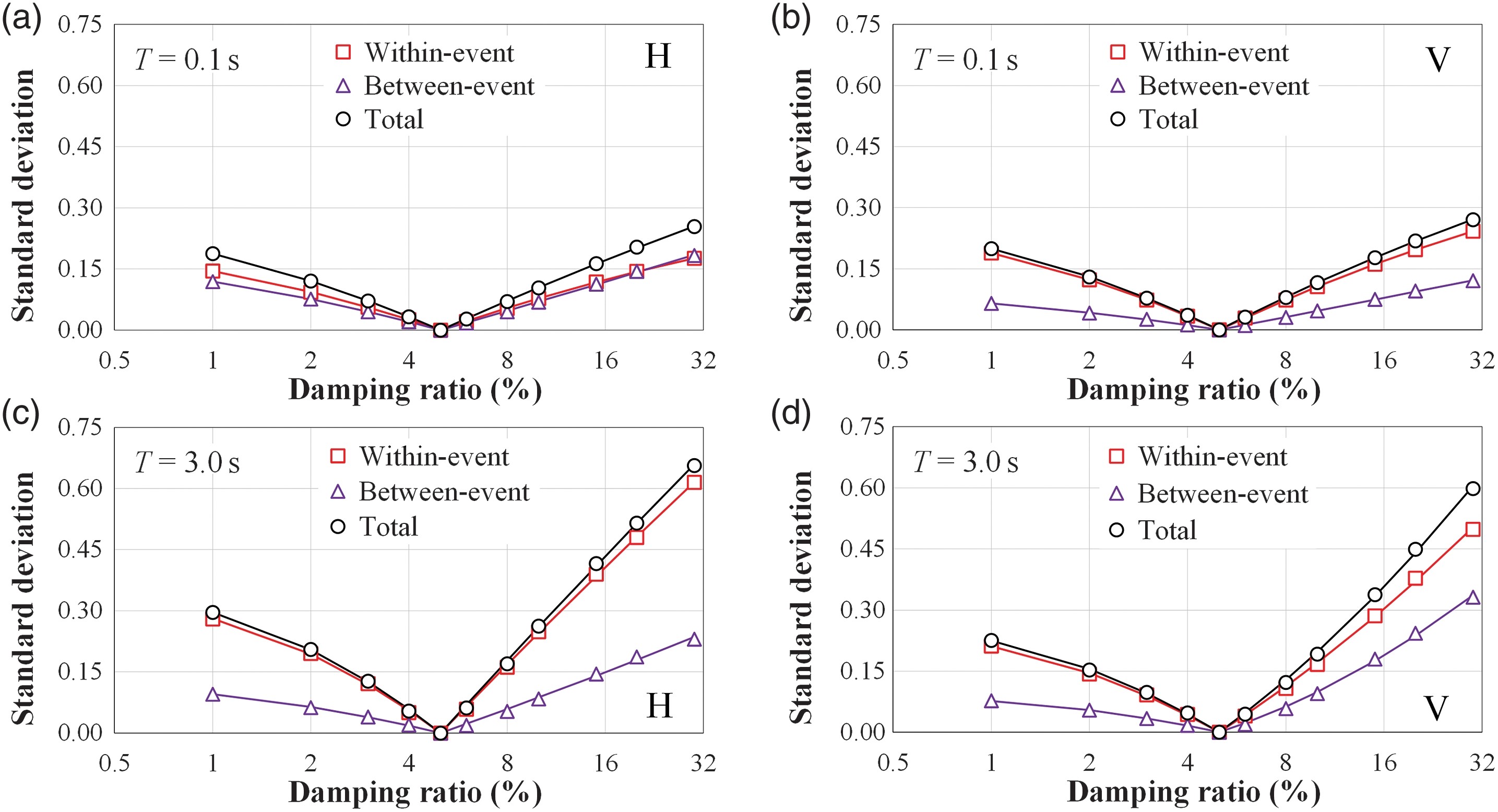 (4)阻尼比為1%時(shí)的所有標(biāo)準(zhǔn)差都小于阻尼比為30%時(shí)的標(biāo)準(zhǔn)差。總標(biāo)準(zhǔn)差與事件內(nèi)標(biāo)準(zhǔn)差接近,表明DMF模型的不確定性主要取決于震源效應(yīng)以外的效應(yīng)。豎向DMF的標(biāo)準(zhǔn)差略小于水平向DMF的標(biāo)準(zhǔn)差。