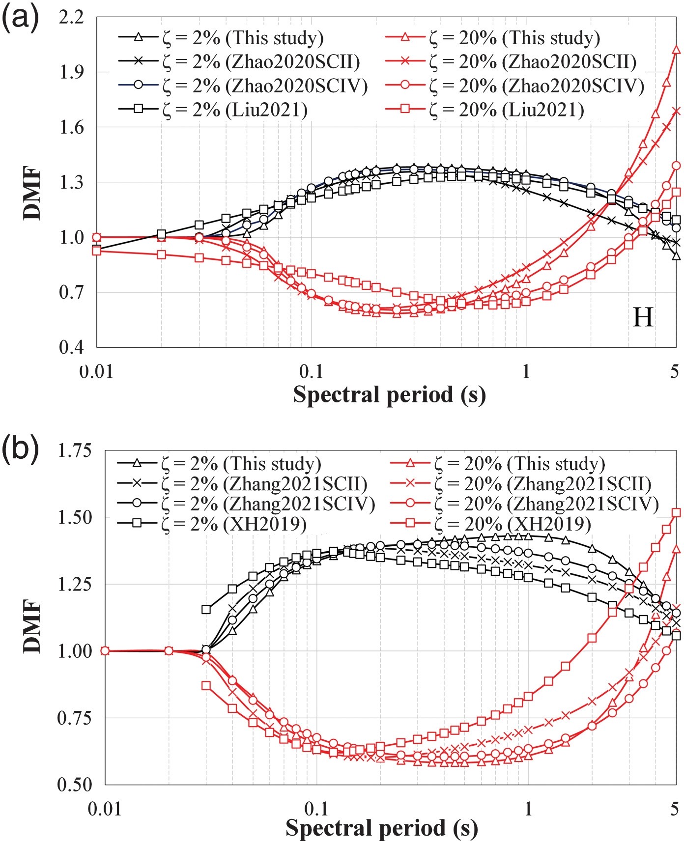 (1)海域和陸域地震動(dòng)的DMF在大多數(shù)譜周期內(nèi),海域和陸域地震動(dòng)的DMF差異顯著,場(chǎng)地條件對(duì)海域DMF的影響很小。在較短的周期內(nèi),海域模型小于陸上模型;水平分量的海域模型在長(zhǎng)周期高阻尼比時(shí)比陸域模型大。