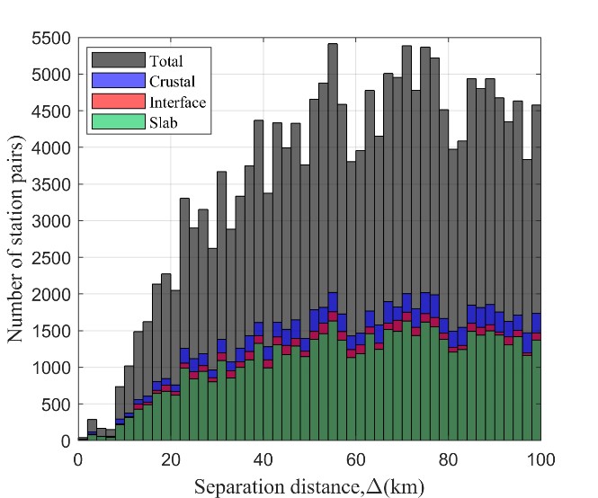 圖2 不同分離距離內(nèi)的臺(tái)站對(duì)數(shù)及計(jì)算的相應(yīng)的空間相關(guān)性值