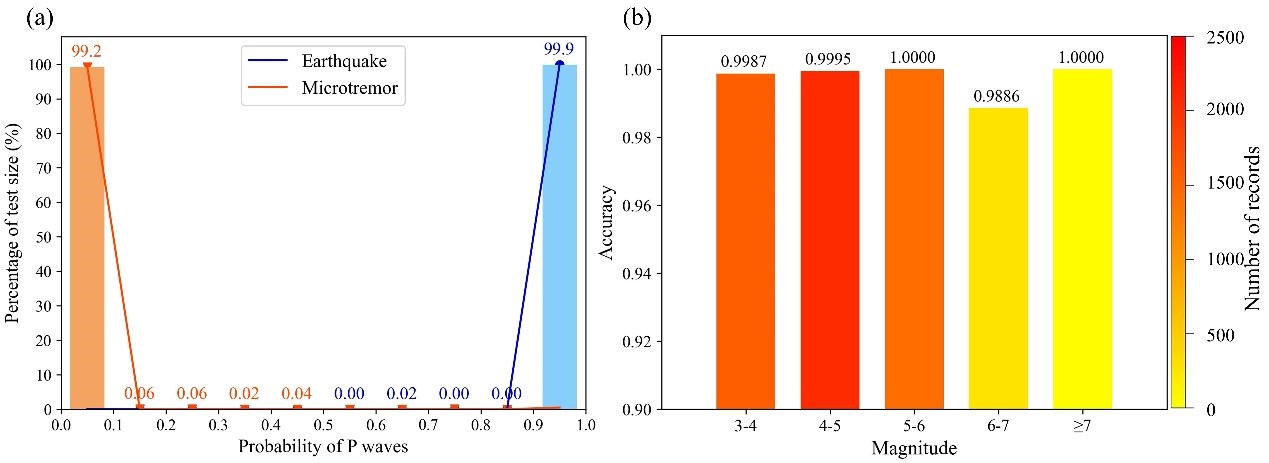 2)通過(guò)測(cè)試集的驗(yàn)證,訓(xùn)練有素的判別器可以識(shí)別出99.89%的地震和99.24%的地脈動(dòng)記錄。圖2(a)為測(cè)試數(shù)據(jù)與P波輸出概率的關(guān)系。橫坐標(biāo)值為0-0.1的百分比越高,證明模型對(duì)于地脈動(dòng)的分類(lèi)結(jié)果越自信;同理,橫坐標(biāo)值為0.9-1.0的百分比越高,證明模型對(duì)于地震的分類(lèi)結(jié)果越自信。由圖可知,兩端的百分比表明模型對(duì)于測(cè)試結(jié)果的自信程度非常高。圖2(b)顯示了模型分類(lèi)準(zhǔn)確率與震級(jí)的關(guān)系,除6≤M<7外,模型的分類(lèi)準(zhǔn)確率均超過(guò)99.8%。經(jīng)過(guò)分析,6≤M<7的誤分類(lèi)也在可允許的范圍內(nèi)。