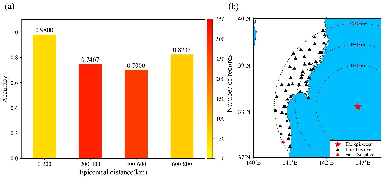 圖3 (a)日本“311”地震數(shù)據(jù)集中,模型分類(lèi)準(zhǔn)確率與震中距的關(guān)系 (b)日本“311”地震數(shù)據(jù)集中,震中距≤200公里的真陽(yáng)性和假陰性記錄位置
