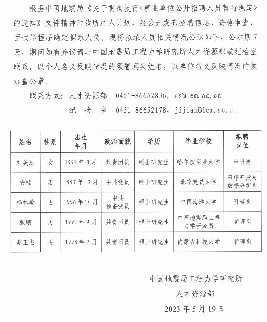 中國地震局工程力學研究所2023年擬錄用人員公示(一)